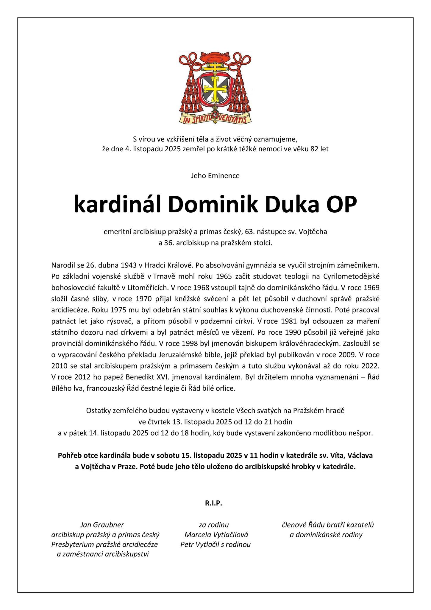 V duchu pravdy bylo biskupské heslo kardinála Dominika Duky, který se v úterý nad ránem vrátil do Otcova domu. Měla jsem čest prožít v letech, kdy byl 24. královéhradeckým biskupem, četné chvíle v jeho blízkosti. Jako redaktorka Českého rozhlasu jsem s ním vedla řadu rozhovorů. Nejvíce mně zůstalo v paměti natáčení pořadu, který jsme připravili k jeho 70. narozeninám. Přijel tenkrát společně se svým dlouholetým ceremoniářem Vojtěchem Mátlem do Hradce Králové, kde jsme procházeli místy jeho dětství a mládí. Naše cesta končila na Velkém náměstí v kostele Nanebevzetí Panny Marie. Celý článek...