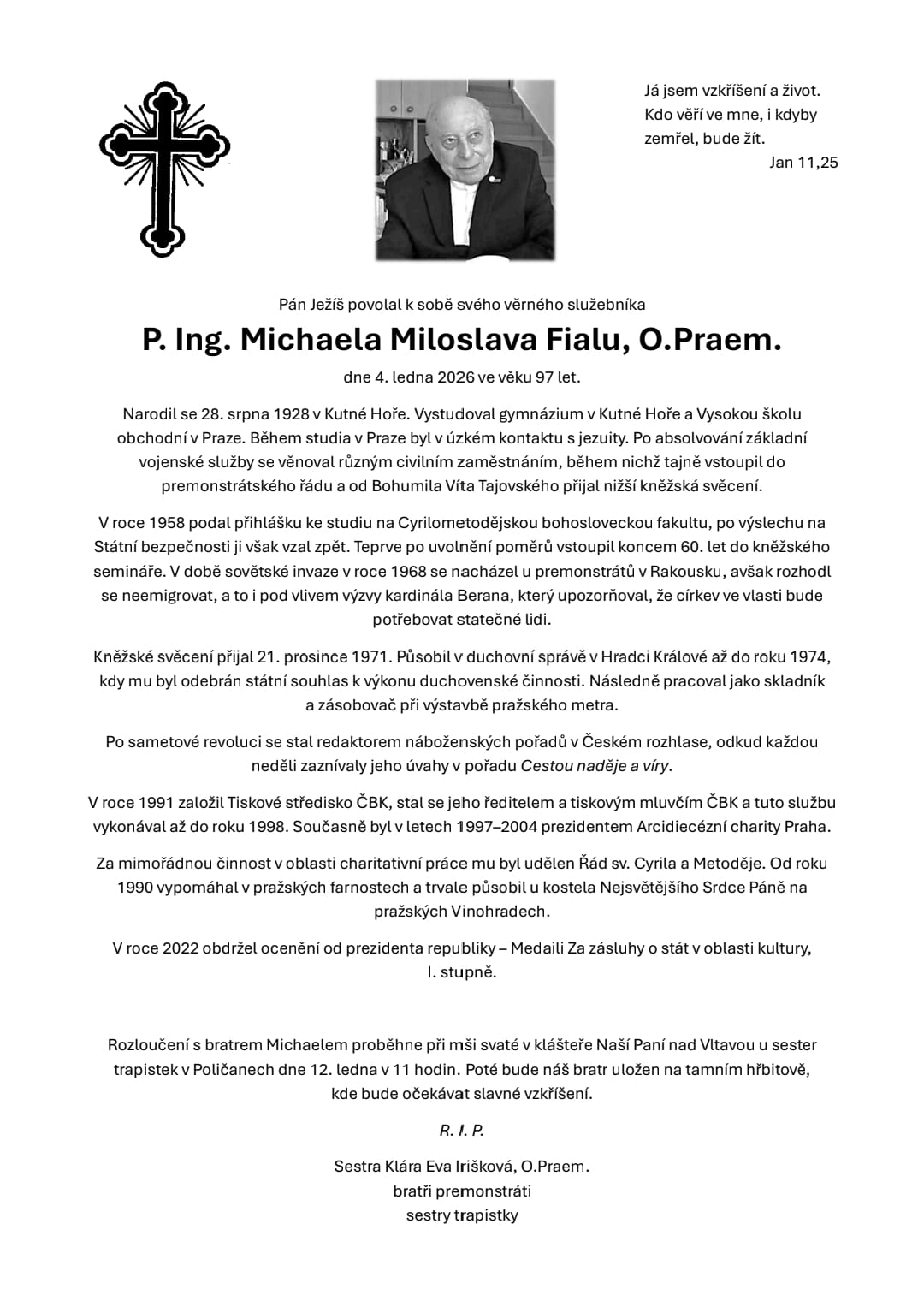 Do Otcova domu se ve věku 97 let vrátil římskokatolický kněz P. Miloslav Fiala O. Praem. Myšlenky P. Miloslava Fialy byly originální, jeho role průkopnická. Byl prvním redaktorem náboženských pořadů Československého rozhlasu (později Českého rozhlasu). Od 1. ledna 1991 byl současně tiskovým mluvčím Československé biskupské konference a ředitelem jejího tiskového střediska, které založil. Po rozpadu Československa pokračoval jako tiskový mluvčí České biskupské konference, a to až do roku 1996, a do roku 1998 rovněž jako ředitel tiskového střediska ČBK. Celý článek...